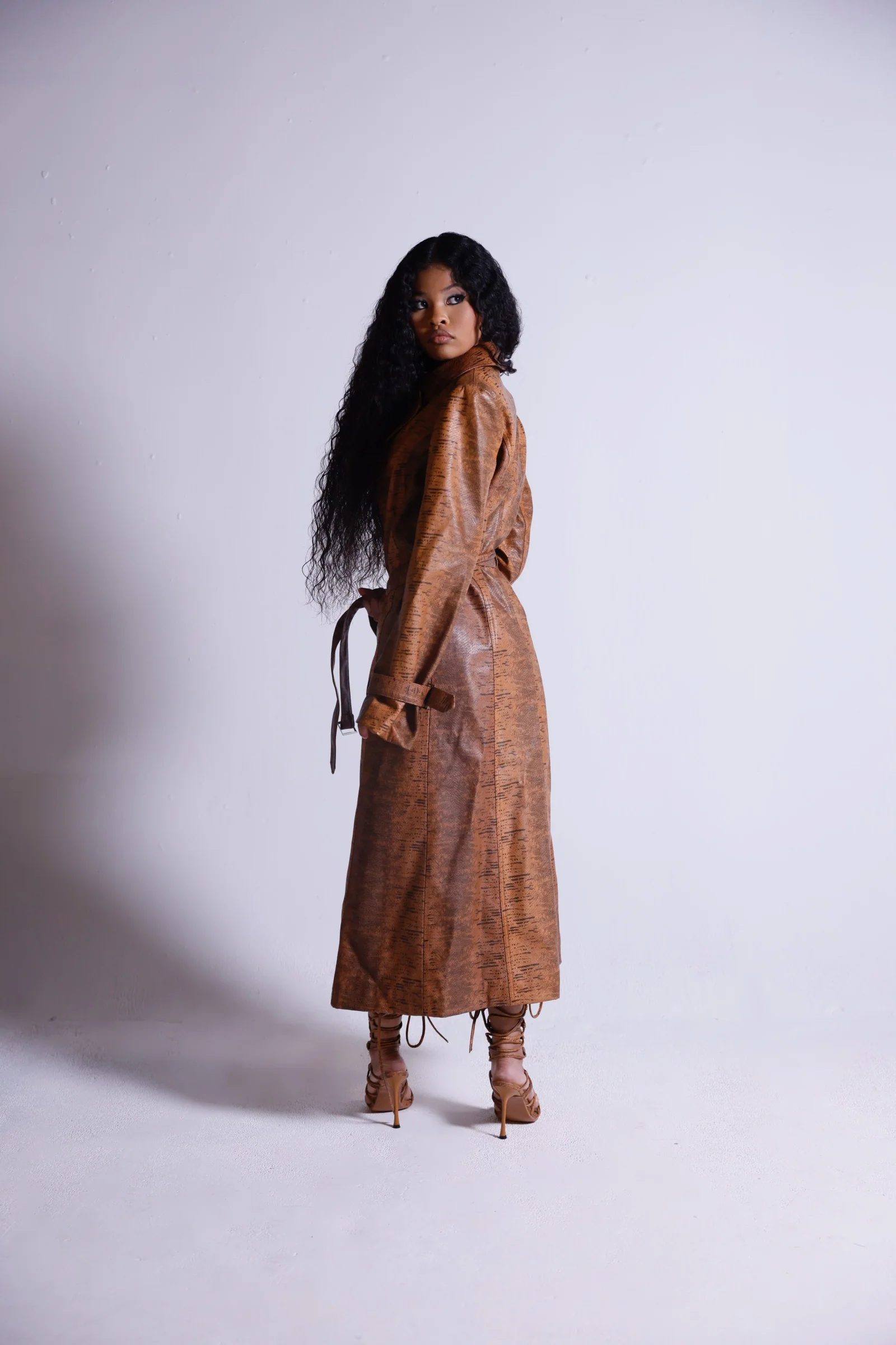 A sharp silhouette in soft faux python printed leather. Clean lines, strong shoulders, fully lined and a waist belt that pulls everything together. Heavy. Wear it open, closed, or barely belted.